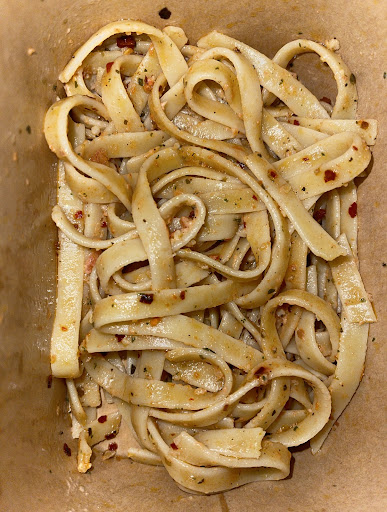 The pasta is DRY, with NO SAUCE to help mask the seriously overcooked day old, tough noodles. In my photos you can see the darkness in the fettuccine from being just left to dry out.