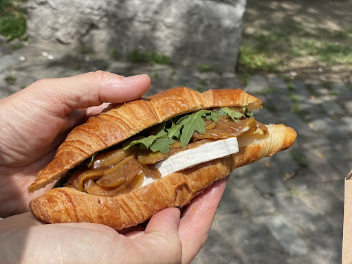 Hereâs the good part of the experience. The person at the window was super friendly and clearly enjoyed chatting about the various sandwiches on offer. We were particularly intrigued by the 10K Sandwich (named for the fact that it was awarded a $10,000 prize at a sandwich contest in NYC), and the description of the pear and brie filling convinced us that it was something we had to have. For our second sandwich we chose a turkey salad with cranberries croissant, a pretty standard go-to for us so we were curious to try this version. We also impulsively ordered up a savoury tart that was on display in the window (thinking this was our typical over-indulgence but what the heck) as well as a small bottled water to share.