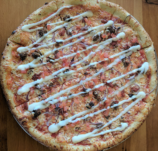 Read moreOk.. I luv this place for the name & the awesome pizza names like "crop circle" or "chupacabra". It's a bonus that they have great vegan options & gluten free for my friends. I took my coworker here for the XL Government cheese pizza it totally reminded him of the "Big Slice" on Yonge St. that shut down... He luv's this place now! I like the paper thin crust, which is crispy to keep the toppings on, the outside crust is doughy if you like more bread, I don't. I like an even balance of topping to crust ratio... If you want more go to the chain places (on every corner! Lol) I would recommend eating there, traffic with the construction in the area makes delivery tricky & pizza enthusiast know it tastes best out of the oven... The steam that comes out of the box is great! Parking is available, during the lunch rush street parking is also available, super busy location. Staff are friendly & accommodating, best ingredients. Water in bottles in the fridge or buy the pop, also recommended. Not to saucy which I like or the toppings slide off on your lap! Lol. Get dipping sauce on the side if you need to drown your 🍕 pizza. Best wall mural!! Atmosphere & pizza names make this place an...