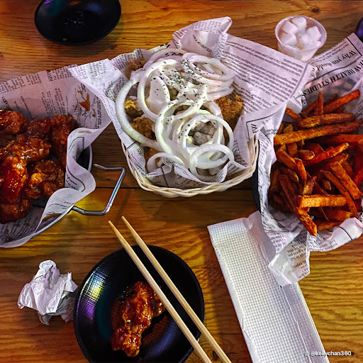 Read moreMy boyfriend and I went here last night. We both got food poisoning. Horrible food quality. We got the half and half soy garlic chicken and Yang Neom chicken, mayo corn cheese, kimchi fries. Both sets of chicken had zero drumsticks or flats, I’m not even sure which part of the chicken we were eating. One piece even resembled the neck of the chicken (I tried to crack it but I soon realized it wasn’t a bone, it was cartilage). Mayo corn cheese was floating in a pool of water and extremely undercooked. We originally ordered the bulgogi fries but it came drizzled in so much mayonnaise, we had to send it back. They brought us the kimchi fries, which were still smothered in mayonnaise but the acidity of the kimchi made for better tasting. However, my boyfriend and I left the place feeling sick and experienced really bad food poisoning once we got home. We were up all night. I have not slept a single hour as I write this review. Another customer was throwing up at his table as we walked in the door. He was with a group of people and was sick the entire time we were there. I would never recommend this spot to anyone I know. I’m surprised they’re still operating with people leaving the place feeling sick to their stomach and throwing up. This place is also extremely expensive for the quality of food you receive. Take my advice and go...