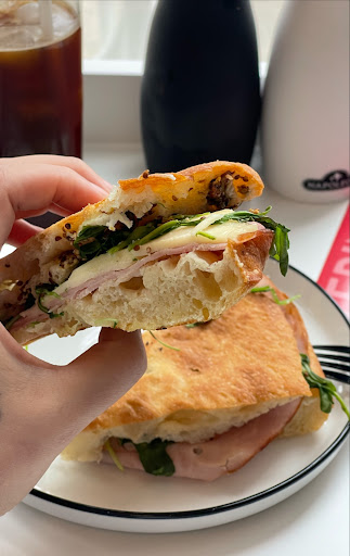 We stopped by for brunch and found ourselves wrapped in the kind of comfort only a French-inspired café can offer. The Vegan Veggie on Focaccia was a standout — layers of roasted eggplant, charred tomato, and zucchini tucked into pillowy focaccia, brightened with a punchy pesto. (The non-vegan option comes with goat cheese, if you’re craving a little creamy richness).