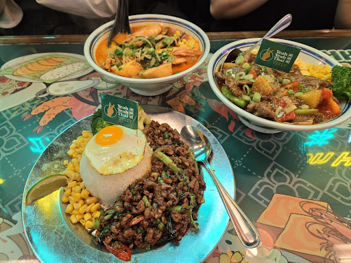 Read moreIn the photo Laksa Satay beef and scrambled eggs on rice Thai basil chili minced pork w/ fried egg