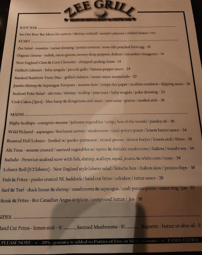 Read moreZee Grill is one of my favourite restaurants in downtown. I’ve been there a few times in the past a couple of years. Tonight I invited my friends to there. Unfortunately, we got unpleasant experience. Food, especially oysters are always the best. The smoky flavour of the shrimp in Surf & Turf impressed me. If I have to describe the dishes in one word, I’d say “fresh”. From the vegetables of salad to all the sea food. The fresh material expressed their original flavours perfectly. I always appreciate gourmet. It means the chef and the owners put a lot of efforts on it. The food is excellent. But the service ruined our joy. We got okay service during dinner. The worst part is the payment part. We are 4 families. When we asked if we can separate the bill. The waitress refused to do that. So, We’re counted as a group of 9. She put 20% gratuity on our bill. When I asked for the merchant to pay by credit card, she showed me the screen with 18%, 20% or more tips choices. Then she left. I called her back and asked why she wants me to choose tips again after she already put 20% in the bill. She said “oh, you can choose no tip.” I call this is a very sneaky move. I don’t mind to pay 20% if we get good service. The waitress didn’t even ask us how we want our steaks done. She made a decision for us. And we only got one time water refill during the 2 hours dinner. And to be honest, we didn’t notice that 20% gratuity apply to a group of 5 or more. The waitress told us it’s on the menu. I post their menu here. Please try to find it if you can. And I have a question for the restaurant: should we to be counted as a group of 9, if we want to pay separately for our...