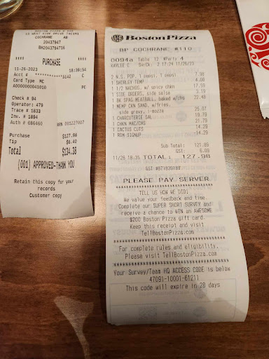 Read moreOn Tuesday, following a lengthy journey, we decided to dine at Boston Pizza. Despite our prior experience in the area, we were pleased with the quality of the food and its freshness. However, we found ourselves dissatisfied with the pasta as it was initially served cold, along with cold sauce. Upon requesting for a replacement and an additional serving of hot pasta, she responded that she did not serve any more hot pasta. We do not wish to spoil our dinner, so we decided to allow ourselves to finish our meal and move on. Unfortunately, this time the pasta was hot but tasteless. It seemed watery then saucy... no flavor in sauce... no sauce and spicy flavor in the pasta.