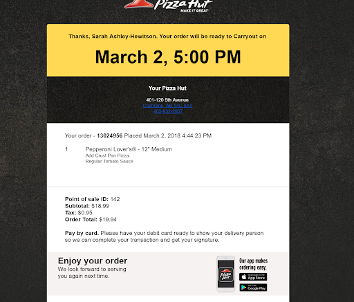 Read moreThis is a difficult review for me to write. I like Pizza Hut food. The food is always good and consistent. The delivery staff is another matter. Last night the delivery driver just dropped our order on the front porch and left. Of course the pizza and wings were cold when we found them. My wife called the store to tell them what happened and got an argument from the manager. Poor, poor customer service. The manager asked the driver if he delivered the order and the driver said yes. I beg to differ, delivering hot food is NOT delivered until the customer personally receives the item. We were 4 meters from the door sitting in our living room WAITING for the delivery if he rang the bell or even knocked we would have heard it. NOTE: If someone from corporate or region is reading this review, please have a delivery methodology and customer service conversation with the...