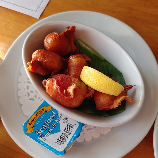 As appetizers, we ordered bacon wrapped scollaps, and battered mushrooms to share. I ordered Scallops St. Jacques, and my daughter ordered Shrimp Fettucine which came with 4 pieces of garlic bread.