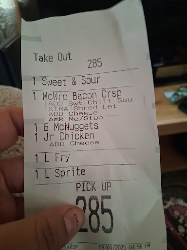 The food is NEVER fresh, the nuggets in particular. If you ask them to make your food fresh (which, according to McDonald's policy, they have to oblige) they still won't make your food fresh. They'll just tell you it's fresh, or, like they did to me the other day, they'll take the nasty old nuggets that you gave back to them, and they'll refry them for 30 seconds and give them back to you again.