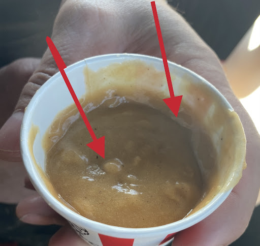 Notably, when we walked to our vehicle and pulled the order out of the bag, we immediately noticed the issue with the gravy and took a picture for reference.