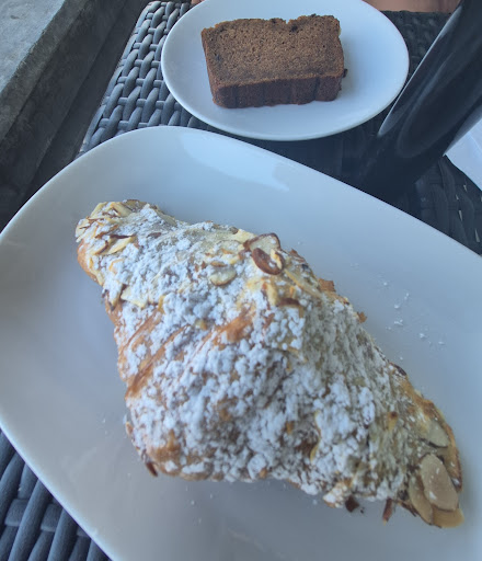 We got a latte and a matcha latte to go as well as a croissant and a blueberry scone. The to-go drink cups had these vibrant illustrations which I found very cool. We sat at the outdoor seating with our dogs and Steve promptly brought our pastries to us. They were delicious and we are a fan of their commitment to baking things fresh daily and using organic ingredients! I ordered the matcha latte with regular sweetness but it wasnât sweet enough for my girlfriend so if you also have a sweet palate probably ask for a little extra kick if thatâs your MO.