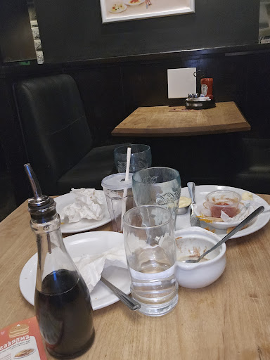 Our seats were covered is crumbs, the wall beside us was covered in long rivlets of brown grease and food and greasy finger marks covered the lower half. The condiments are greasy and not wiped. Sides of seating are covered in layers of dirt.