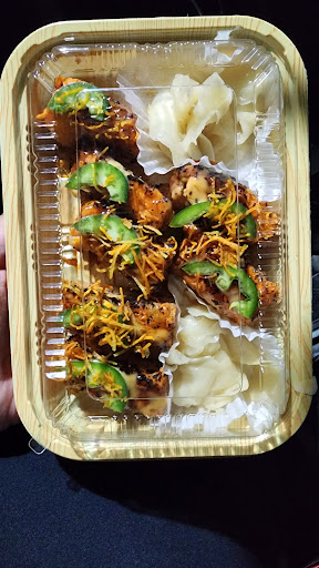 The spicy salmon oshi did not state it would have a sauce, that too a sweet sauce. I also was only given 7 pieces but its suppose to have 8. It was far from spicy. I don't know why the SPICY salmon oshi had a sweet sauce but it just ruined it.