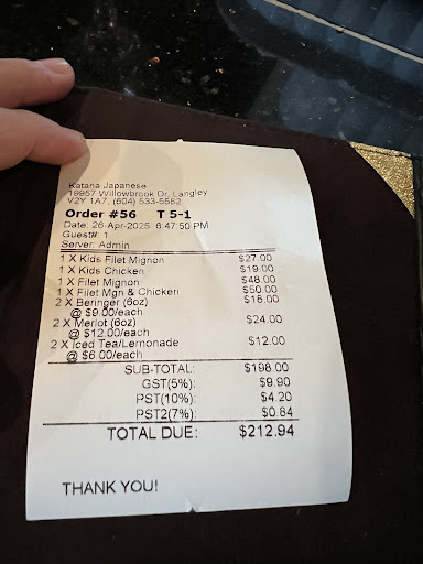 On to the food… I ordered chicken karage to start as we waited for the rest of the party to arrive. I don’t know what they consider karage to be but it was a plate of soft pan fried cubed chicken bites that looked like something my teenage child would make at home. Chicken karage should be a Japanese fried chicken with texture and crunch from the batter, not small soft pan fried pieces of chicken, it was not good at all and I returned it. I ordered the ultimate teppenyaki which was filet mignon, lobster tail, scallops, and shrimp. Overall it was good but not spectacular, and when the price point is $93 I would expect better. The fried rice was subpar, and the 2 sauces that were served to accompany the meats, seafood, and veggies were just ok. Osaka includes chicken in their ultimate, is slightly cheaper and much better overall. Kobe and Osaka in Vancouver are far superior to Katana in Langley, especially considering you aren’t saving any money here. There’s also absolutely no atmosphere and the decor is need of a face lift.