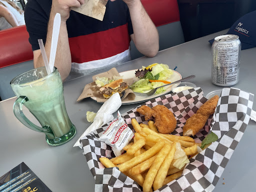 Read moreWe went here on Canada Day, we were surprised to actually get a seat as we expected a lot of people at lunch time. There was no line up either when we came in but as soon as we sat and waited for our order people started showing up and the line started to build up. The 50's Diner theme is pretty cool however I feel that the whole place itself needs a bit of updating or cleaning perhaps. Our food was served at a reasonable speed, My husband ordered James Dean Burger w/ fries and I ordered Chicken Fingers with Salad and Rootbeer Float. The sides were interchanged when they served our orders, it was not a big deal but it would have been easier for us if they have served it correctly. The James Dean Burger was a bit too greasy for my husband but otherwise the taste was good. The chicken fingers tasted like they were store bought like Real Canadian Chicken fingers - so I was a bit disappointed with that. The only item that made me happy was the rootbeer float just because I have been wanting to get for awhile and I didn't have the chance so finally, I had one but still nothing extraordinary. The...