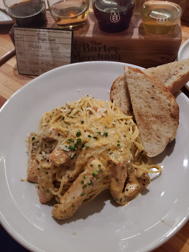 Have been to The Barley Merchant at least 20 times now and lately leave more disappointed than I was the previous time. Not too sure why I keep returning. Probably because itâs one of the few places in Walnut Grove for late night food. After this last visit I donât think Iâll return for anything more than an afternoon flight or a glass of cider - which they have a nice ample selection of. Not all are hits but thereâs certainly something for everyone. This last visit on the night June 30 was exceptionally bad and left both my guest and I wondering aloud the entire 2 hours we were there why we bother coming anymore. It no longer seems safe to go after the dinner rush as staff no longer care about service, continuity, or quality and only about getting off in time to have a drink at the bar. We were greeted by our waitress who was friendly enough but made multiple comments about how it was âso slow and she couldnât wait to get out of thereâ - sorry to keep ya girl! đ We started off with an order of house spicy wings and pickled cucumbers. Cucumbers were fine enough for price point. Iâm sure the wings would have been fine had they actually been sauced - instead they were just drizzled with chipotle mayo. At first I thought it was just a really bland sauce because they were so wet - turns out it was just grease. So much grease. Incredibly disappointing given the price. I understand what wings cost now a days - but that means the onus falls on the restaurant and itâs staff to ensure quality. We would have asked for a remake had we seen our waitress somewhere on the mostly empty floor being it was 10:30pm; As it was we had to flag someone else down for napkins, side plates, and cutlery. Another oversight. When she came around to collect our dishes we mentioned the wings and she laughed it off being âa bummerâ with no effort to correct or sympathize saying âusually our wing sauce is pretty goodâ - we wouldâve liked to know! Next we each tried a cup of soup. Both nice portion sizes. The clam&corn seafood chowder was nice, thick, and chunky with a good amount of crisp bacon and clams on top albeit oddly almost overpoweringly sweet(like the juice from a can of corn was used). The tomatillo soup tasted nice but came cold. Took a few moments to flag down our server to have it heated up but it came back barely lukewarm. For entrees we each had the Steak Frites and shared a Chorizo Gnocchi. Gnocchi seemed small and was quite dry, the flavor was nice. However the steak frites⊠WOW! Yikes! Advertised as a popular fan favourite âback and levelled up after a hiatus from the menuâ. Frankly it should stay on hiatus. đŹ $30 for a hunk of salty meat on some of the worst somehow burnt tasting but still soggy bread with a side of bland and even soggier fries. Not even a touch of greens on the side for some color. Not only did they both come out barely warm, we could hear the kitchen guy complain about having to cook a steak âthis lateâ from our booth across the service station. Awkward. Even the london fog crĂšme brĂ»lĂ©e that is loved so much seemed lacking in flavor this time. Didnât have an opportunity to mention our disappointment over the steaks or dessert as our server had brought our checks and asked us to settle up while we were eating because she was off shift. Sad to say neither one of us were really that surprised by any of this having been a few times after 9pm & having similar experiences. Whatâs the point of staying open later into the evening if all care and attention are thrown out the window. Over all - not a bad place to grab a flight(there in an incredible and ever changing tap rotation worthy of props) or a late night cocktail, but leave your expectations at the door. Service is inattentive, simple FOH expectations are not met, and the cleanliness leaves something to be desired(sticky table/very dusty behind the booths) however Iâll no longer recommend it to friends or family. Worth noting that every beer, cider, & spirit is sourced from BC - a nice touch, but FOH & the menu need a serious overhaul....
