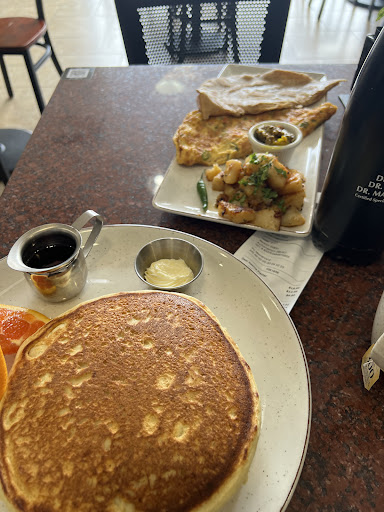 Anyways, the food really has some flavor! I ordered the Desi Nashta (consisting of an spicy veggie omelet with green chilies-it was a bit spicy but still tasty!) and spiced hashbrowns were on the side. It was flavorful, but more on the oily side for my liking. I also ordered the pancakes and the portion was quite big, though a little dry. Also, the toppings cost 2.50 extra. I asked about the vanilla cream and was told it's just whip cream... so I'd skip that next time. As for the atmosphere, the place was very bright and clean and the layout is interesting. The garage (larger door) is open during the day, so you can sit on the patio, but it does get quite cold because they do not shut it for the people inside. Overall, service was okay. There is only one main server serving everyone and sometimes the chefs would come out and bring the food to you, if it gets a bit busy. Overall, the Desi Nashta really stood out, but the rest was like...