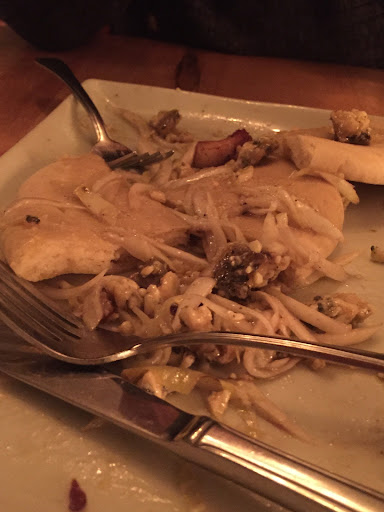 À l'arrivée, déjà, en dépit d'une réservation dûment faite, on nous offre deux tabourets au bar alors qu'il y avait 6 tables libres! Enfin attablés, je suis dérangée par le froid. J'ai passé le repas avec mon manteau sur le dos, et je n'étais pas la seule ainsi. Pourtant, il y avait des calorifères et même un gros foyer en coin, inopérants. Quant à la musique... c'était du gros RAP (eh oui !), et tellement fort en plus.