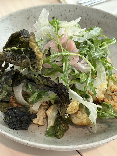 For our lunch, we decided to share the following three dishesâwhich, somehow, all ended up being vegetarian (though not on purpose): Spring Vegetable Flatbread ($16): An unexpected favorite for me. It's a simple dish but wonderfully executedâperfect for hot weather. Crispy bread topped with zucchini, tomato, arugula, and goat cheese, served with a balsamic glaze. Cauliflower Steak ($25): A classic dish I usually enjoy; however, the execution this time could be improved. The smaller florets were quite oily, and the cauliflower itself was rather bland. The ratio of bean purĂ©e and herb chimichurri felt off compared to the size of the cauliflower. Mushroom & Pea Risotto ($23): This was definitely the prettiest dish, thanks to its bright green color. It tasted fine, but I was expecting a stronger mushroom flavor. The dish lacked the lusciousness you'd typically expect from a risotto (though the parmesan chips were...