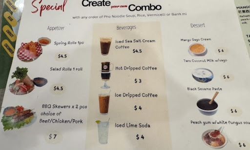 They also had this “create your own combo” but you need to order item one from each category, making this combo an additional $13 - $20 depending on what appetizer, drink, and dessert you choose. Sooo ultimately, it’s not really a deal and you can’t just “add on” one item to make it a combo. But it also isn’t specified on the menu that you must order all three. Anyways, I ordered this shortly after receiving the bun bo hue and it never arrived. I even waited 10 minutes after my husband finished his special pho so I decided to just...