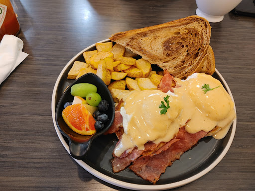 Food: I've only visited for breakfast and I am a creature of habit so I've only ordered the Benedicts - the smoked meat twice and the mushroom once. Smoked meat version is in the photo attached, with an add on of marble rye. The hollandaise needs some work in my view - very thin, not rich enough for my palate (but Tabasco balances it out well) - but the eggs are always poached perfectly. I preferred the mushroom to the smoked meat - the mushroom didn't compete with the subtle hollandaise. The little fruit cup is always fresh and varied. I wish the hash browns had an option for shredded, but no complaints for the chunks beyond preference (I'd personally love a bit of a crunchy surface from being fried in butter).