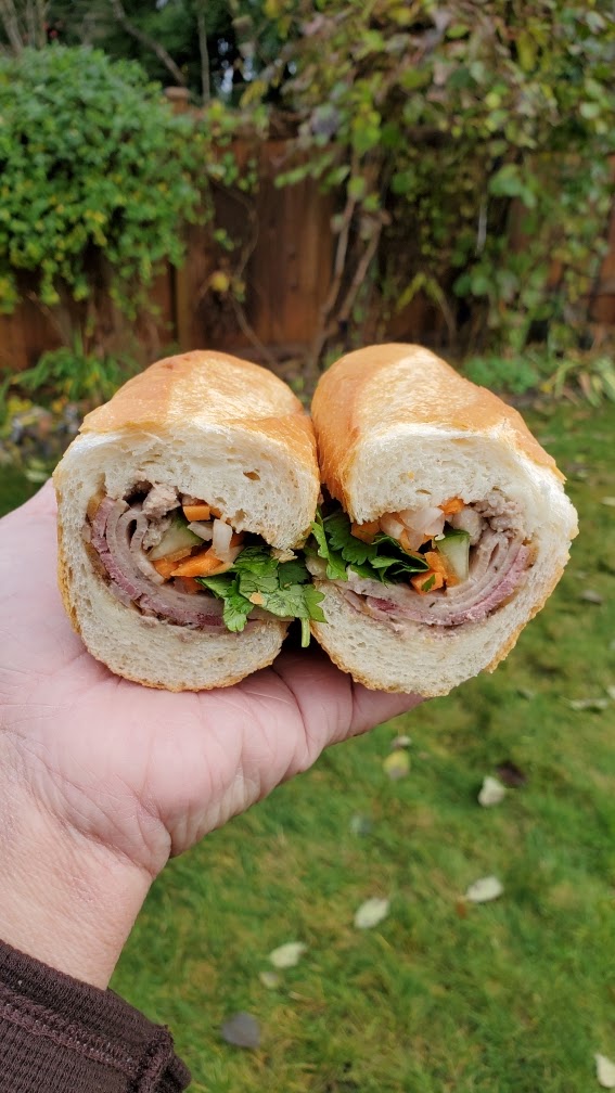 Omgosh you know originally we were gonna eat the sandwiches after doing a bit of grocery shopping and heading home but we ended up eating our sandwiches in the car, making a crumb storm 😆 didn't matter - the crusty fresh bread and delicious pate and assorted meats alongside pickles, cilantro, cucumber, and serrano chili pepper strips tasted so dang good! Honestly I was full and looked at the sandwich but there was still half of it left!! It's a great sized sandwich! Ate it all of course hahaha, you cannot have leftovers XD cause the next time you eat, you'll want a whole one again! 😛