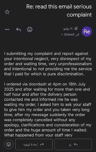 I sent to you my complaint email yesterday then I posted a review in google map and you only reply to the public review not my email. This is my reponse to your response that clearly show you really do not care about my experience and you just care about public review and your response involved many covert projection, blame shifting and lies that expose your lack of professionalism, respect and basic customer service. I sent you an email before writing the review here and you never replied to me. In your response here you added the same email address I already sent my email yesterday as if I did not send anything and you would reply, but I sent it before and you are the only one who did not reply to my email and only care about public fake response, I also sent you a private message on Instagram yesterday and you again never reply and I strongly reject your manipulation and covert projection, you are the one who intentionally not reply my email and insta messages I sent before this posting review. You only replied to the public review so other customers could see it and not because of my complaint and caring about my own experience. This shows your lack of credibility, manipulation, covert projection and lies. DoorDash never contact me at all as you falsely claim and thid lie by you clearly shows you are very disrespectful, discrimination againt me and covertly trying to project it to me instead of dealing with my complaint with professionalism, respect, high honesty and high customer service. This is also clear attempt to escape your responsibility and lie as if you did everything but in fact you never anything just care about public fake review, and I strongly reject all of your manipulations, covert projection and blame shifting, lies, very disrespect, unprofessionalism, lack of customer care toward my complaint. Your response also show you take it personally not professionally with considering that I AM THE CUTOMER and you must be not discriminated towards me, I stated in my complaint what has happened with me in details and your response focus only on how to back and fasley try to project to me as you and door dash againt me as if it war not CUSTMER complaint and I strongly reject your unprofessionalism, professional immaturity very disrespect, lack of basic customer service. I strongly demand compensate me for what you did to me yesterday and I strongly demand that you send to me the evidence that you not the one who cancel my order and your contact of doordash.