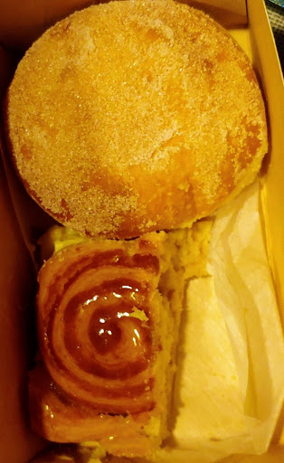 The food is delicious, but if I pay a decent amount for quality baked goods then I expect the employees to pack my food properly. This bakery was on my way home (which is about 40 mins travel), when I got home and noticed the mango coconut donut was missing half of its icing/frosting because the employee put it in sideways against the wall of the box... I haven't tried this donut yet and now I guess I will have to scrap the box to enjoy it... Maybe next time your employees can put the food carefully in separate containers or at least let me know you did that so I can fix it myself...