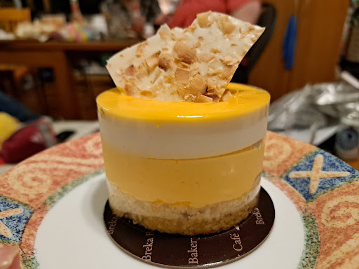 HUGE NOTE for Celiacs. If your autoimmune disorder isn't so bad that you're able to walk into a non-GF bakery, be advised their GF items are often on the bottom shelf of their display case. I politely suggested they keep their GF items on the top shelf so there is a lower likelihood of crumbs from non-GF items falling into the GF items. The gentleman at the till rolled his eyes, said, "really?" (his voice dripping with disbelief and a complete lack of caring) and then told me my total. Listen, I get that it's perhaps unreasonable to expect a non-GF bakery to not have any cross contamination with their GF items, but maybe at least try? Also, I'm not 100% convinced their mango coconut mousse is, in fact, GF. I'm not Celiac (just gluten sensitive) so it's not a huge deal if I have a bit of white, refined flours but after not quite ⅓ of the mousse my stomach started feeling the way it feels after I have a forbidden bite of a donut...