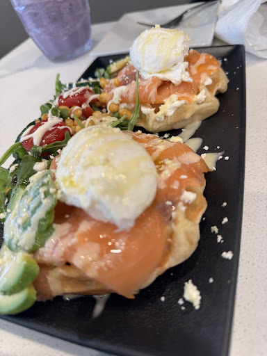 Their smoked salmon eggs Benedict is an absolute masterpiece: perfectly poached eggs with silky, runny yolks atop fluffy waffles, generous slices of delicate cured salmon, creamy avocado, and a light drizzle of tangy hollandaise. The accompanying micro-green and baby arugula salad, dotted with cherry tomatoes and crunchy puffed grains, provided a delightful fresh contrast.