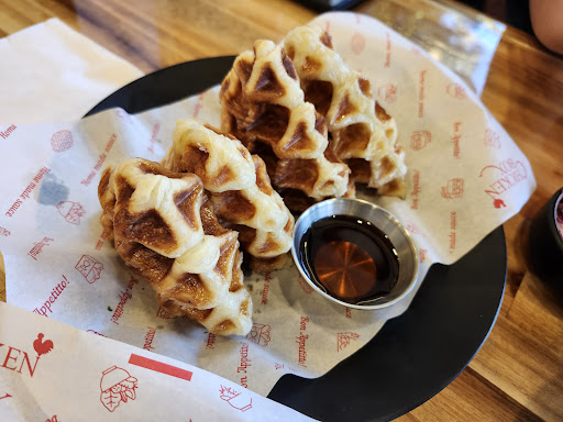 If you have room after the chicken - definitely try the waffels. Their waffles are chewy and sweet, especially if you drench them in maple syrup! They're more like a croissant-waffle than a Western-style Belgian waffle.
