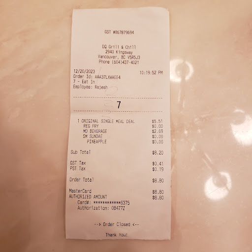 Read moreWe bought one $8 dollars meal deal last night in this store. However, the store charge us the price was $8.2ďźwithout taxes ďźand plus taxes total charged us $8.8 . We also have the experience to buy the $8 meal deal in elsewhere e.g Richmond DQ, the store did only charge us $8 meal deal and not $8.2 for the meal deal. So unreasonable with the PST charge in the Kingsway shop. Thus, we tried to get the refund of the unreasonable amount, but the cashier said that the system is set like that and no refund can be done. The cashier helped us to call the Manager to solve our problem but the manager said that he was off duty and he would not manage our complaints at this moment. He stopped the conversation and we were helpless. The staff told us to come back to talk to the manager next day if we insist to have the money back. Oh my God, we are not living nearby and have to drive a long way to the Kingsway DQ. It's very obviously that there's a big mistake about the charge for $8 meal deal and why no one could help us to get the refund of the unreasonable price and why there's PST charge ? It's very ridiculous to ask us to drive a long way to come back next day for their mistake . Why the manager could neglect our complain ,not to help us? We love DQ ice cream but the Kingsway store made us scare of the unreasonable charges. We are very disappointed with their service especially...