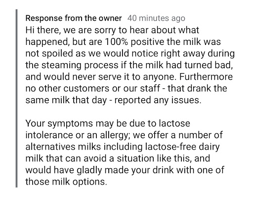 I drink this kind of coffee regularly and have never encountered such a problem. I don’t have lactose intolerant problems. Please Do Not ascribe this to me as if you were a doctor. You are not in a right position to say that. Hope your business is not as CASUAL as you saying that. Your right position is to take good care of your business, look for the real reason for this case, instead of finding excuses from other people. It’s YOUR responsibility and liability, not others’ !!!