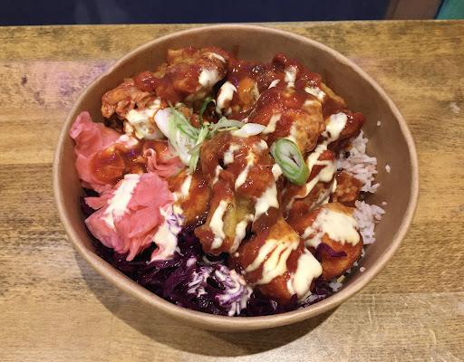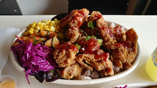 Read moreI was really surprised how much I liked this. I ordered on Ubereats, and had the sampler, a fried chicken leg and thigh, and a rice bowl with bulgogi beef. The "chicken bites" in the sampler really impressed me because they were big, meaty, and moist inside with a very crunchy outside (so not some lame popcorn chicken or nugget). Scale is difficult to see in the photo of the sampler and I am so used to a regular take out box, so I was expecting something much smaller and was delighted by how massive it was. Also that they had compostable containers mainly. Sauces were good. Rice bowl was a generous size and there are several protein options. I found their falafel kind of dry, but their fries were great. I think the bites were even better than the wings. I liked the garlic mayo a lot (and it was better than the vegan mayo which did not have a strong plum flavour). I think the sweet chili glaze has a bit of cinnamon in it. So basically, huge portions, good fried chicken, and lots of flavour in the sauces. I like the salad bowl vs rice bowl option too. Both corn and edamame in them and some veg is great to have. Their red radish pickles are very sweet...