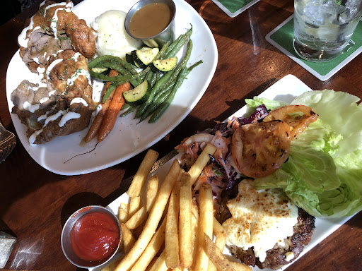 The meat on the Ploughman's board was quite good and plentiful, but the bread tasted like cheap grocery store buns. Tiny wedges of cheese and a little bit of pickled veg. Could use a little balancing.