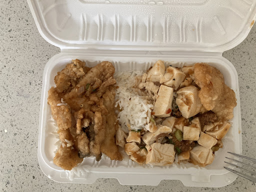 Not much else for variety. Besides the rice, there was a pan of noodles all dried up from sitting there too long, one pan of eggplant (nothing else with it), a pan of beef and bell peppers, a pan of nappa cabbage and vermicelli, Szechuan bean curd with slivers of meat, and three dishes of the same breaded halibut cooked three different ways. Nothing else.
