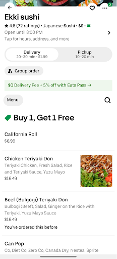I have had their poke, sushi rolls, miso soup, udon soup, chicken teriyaki and beef teriyaki. Never disappoints :) They have had a 2 for 1 deal on for a while (see screenshot). Not sure how long it'll last, but it's a good deal. Sometimes, I order it and save the free one for dinner...