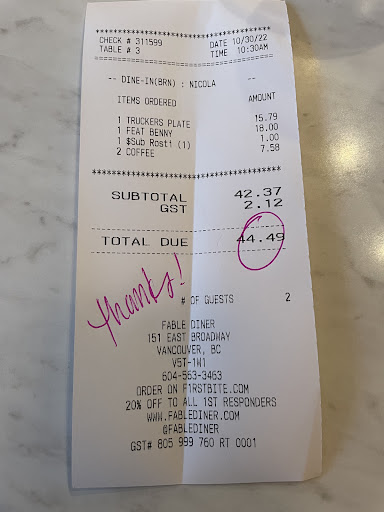 Read moreI will start off by saying that the average Vancouver brunch enthusiast has never worked in service and just shows up to a brunch spot on a weekend at 12 or 1. while I have never worked at Fable, I have worked at another breakfast resto in Vancouver. with every table packed in the room and a line out the door people still somehow expected to be seated instantly, greeted, coddled and treated as if they were the only person in the world. I have been going to fable for five years now and while the staff is always changing as well as the menu, I have never had bad food here. Of course sometimes there is a line when every table in the room is full and it’s a busy weekend brunch and of course sometimes there’s a wait - due to again every table being full during a busy weekend brunch. upon reading the above reviews, all I see are entitled yuppie expectations from people that apparently want their shoes shined and their faces pampered while going to get a very reasonably priced and delicious breakfast during an incredibly busy service weekend. Again, the food has always been better than average// reasonably priced, and the servers are always kind, even when slammed. I have gone to fable at 4 PM on a Thursday and I have gone to fable at 1 PM on on a Saturday and what’s important is that the restaurant delivers the same enjoyable experience in its cosy atmosphere with good food. I cannot say the same about most other brunch and breakfast restaurants in the city, including the one I used to work for. While very few restaurants in the city deserve a perfect score, I am avidly adding one to Fables record (on Google) because it definitely doesn’t deserve the first world judgement of our yuppie population expecting so much from a place that does so much better than most others in this backwards city. Lastly their rosti out performs ANY and EVERY hashbrown or hash...