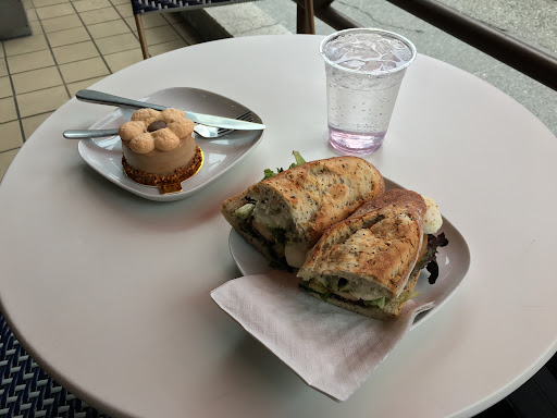 Read moreThe selection here is really extensive for a coffee shop: sandwiches and crepes all made to order, soups, various sweet and savoury baked goods, plus coffee and tea and more drinks. Nondairy milks are available but it looks like none of the food is vegan. There are plenty of vegetarian choices though. Very hard to make a choice since everything looked delightful. I had a tomato and bocconcini sandwich, a hazelnut mousse dacquoise w/ pear compote (the pastry of the month), and a lavender Italian soda. Was going to order a crepe but the barista told me it would be 15-20 minutes when I was hoping for a quicker lunch, but maybe next time. I really liked my sandwich, anyway. I had it on the multiseed bread which was hearty and fresh. I loved biting into the balls of fresh bocconini too. Sometimes sandwiches with pesto come out too oily for me, but that was not the case here. The pastry was also fantastic! I loved the contrasting textures and richness of the hazelnut cream, and the tart, juicy chunks of pear inside were a nice little surprise when I had been expecting something more jelly-like. The soda was good too. It was hard to mix the lavender syrup in, but once it got mixed it was very floral, and they didn't use too much syrup to make the drink too sweet. They have the clean, elegant Parisian aesthetic down inside, but I most enjoy sitting on the patio which is covered and elevated away from the sidewalk level, so you can relax away from the weather and crowds. Very welcoming and thorough service from the staff member in training who took my order. Drinks are called out from the bar, but food is brought to your table when you eat in. FYI they have mugs for coffee and plates and silverware, but my cold drink came in a plastic cup. Not sure if it was just a mistake or if they just don’t make the cold drinks in glasses, but I will watch out for...