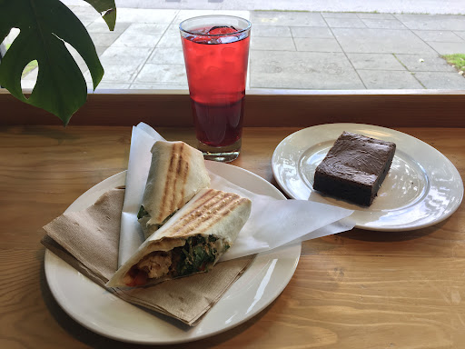 Read moreI was really impressed by my first visit here! Lots of seating available inside and a few tables outside. Nice atmosphere/aesthetic and lots of seating, but some of the seating is a little tight, and it was also pretty boomy inside. The staff was friendly. All of their baked goods looked fantastic! All of the food is housemade, including the bakes. There are good options for vegans here: a sandwich and a wrap and a few baked goods (muffin and cookie, maybe there were others but I didn't get as good of a look). I noticed that they had "gluten-friendly" muffins, but they were in the same case as non-gf baked goods, touching, so not very helpful if you have a serious issue with gluten like celiac. Drink menu also had some fun seasonal stuff in addition to the standards. I got the vegan chickpea smash wrap, a fleur de sel brownie, and a crimson iced tea. The chickpea wrap was sort of like a vegan breakfast wrap, but kind of also just doing its own thing. It had memorable flavours, different from other vegan wraps at coffee shops. I especially loved their vegan ricotta in the wrap! The brownie was as good as it looked - very dense and fudgy. The salt was added tastefully and enhanced the chocolate. I was indifferent on the iced tea, but that's just because I don't like hibiscus very much (I was expecting "crimson iced tea" to mean rooibos, but it was actually hibiscus), so I'll have to try something else to be able to make a fair judgement on their drinks. The total for food was about $21 which I think is fair. The quality was pretty high across the board. The wrap was a modest size but it was enough for...