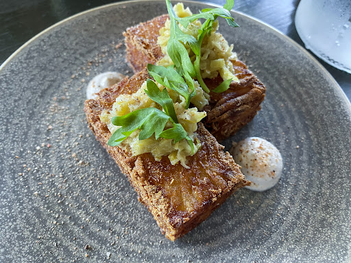Read moreWow, a Michelin Guide restaurant that does not accept gratuity. That explains a whole lot – explains why the service is not up to the level we’ve come to expect at good restaurants in Vancouver, at least. Knowing this now helps me understand not to expect service since we don't have servers that attention to wipe tables of crumbs after each course, or placing appropriate fresh cutlery while reminding us what the kitchen will deliver next. You don't get that at Folke – which is in fact fine, it's simpler and more cost effective. In fact, the person who took our order thought we were done when we were still waiting for the last plate. Another person we asked if last dish was savoury or sweet didn’t get the hint that plates and cutlery were used with traces of savoury foods, and when we requested clean plates, we were asked to keep our knifes and forks which was weird. During our entire meal, no one asked us how we were enjoying the food, and the expeditor from the kitchen did not tell us what were on the plates presented. Now the food: I wasn’t successful ordering Baby Gem Salad because my partner thinks we eat enough lettuce at home. Okay then, our first course was Potato Rostii. I am glad the portions were delicate because of the glycemic index and we didn't precede this with some greens. These had probably been cooked and chilled before they can be cut to such perfection and deep fried. The crispy ‘skin’ was perfect, yummy (but unhealthy). Our second shared plate was Baked Strata, chickpea & tofu custard, sourdough, charred brassica, pumpkin seed parmesan. It was disappointing. My partner described it as “left over from my fridge that didn’t get warmed up properly”. Obviously, we shouldn’t have ordered two baked dishes back-to-back. Mushroom toast would have been a better second plate after the rostii. I was grateful for the few pieces of leaves on the strata. Our last plate was dutch baby because of our somewhat sweet tooth! But it was nothing like the Dutch Baby I used to make in my iron pan. It was deflated and made soggy by the creams and fruit on top, served in a round salad bowl. Definitely missing passion. We would have appreciated the pancake served straight out of a hot oven on the original hot iron pan, with the fruit and creams on the side. The granola was tough (hard) – my dentist—had he tasted it—would have shaken his head at me and said “no, no, don’t eat that and crack your teeth!” I was disappointed that we didn’t get to taste the mushroom toast as we were both full after the third shared plate. Will we come again? My partner thinks not – "I can drop you off if you want to eat here again next time." I will return though as I am grateful that Folke is there to provide an all-vegan menu. I wish Folke all the best and hope that they will be around for a long time to come. Apart from the deep fried mushrooms (chicken waffles), most everything is HEALTHIER than what’s served in the non Michelin vegan junk food places on Main Street. I love the fact that I can just order anything without having to worry that I might be ingesting egg or dairy. The Dietary Restrictions FAQ on their website says “We require 48 hours notice for dietary restrictions such as no onion and garlic.” At least they are willing to accommodate my health problems, yay! I will eat here again and try everything else. Dear folks at Folke...