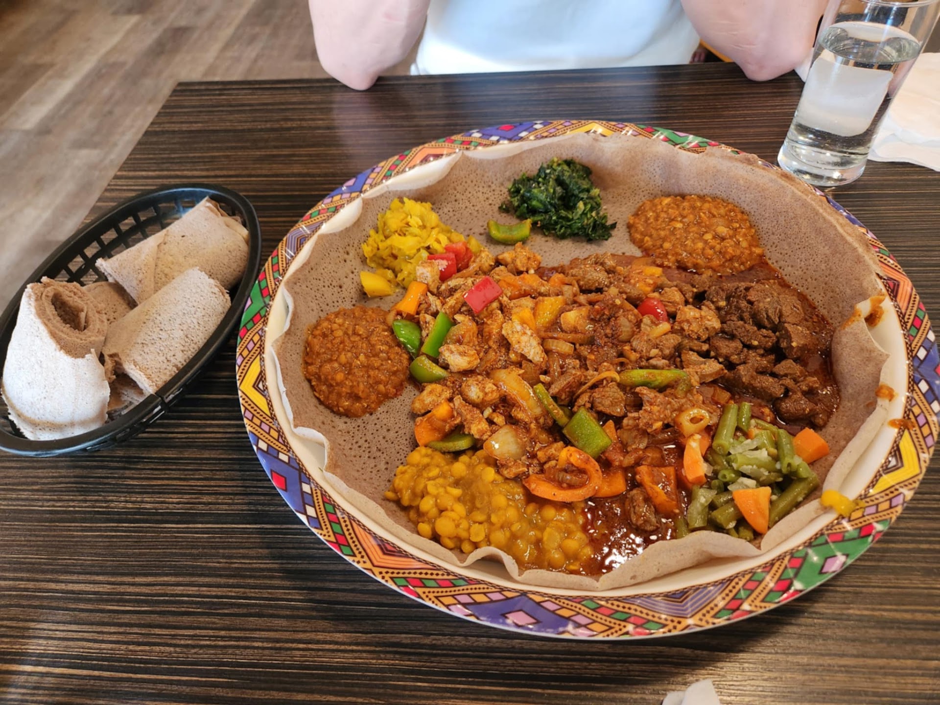 I get 4 rolls of njera bread, which is a kind of slightly sour pancake-bread which serves as a sort of napkin with which to pick up the food from the plate. Lots of fun.
