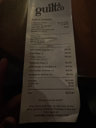 Incredibly disappointing because i actually like the venue. But to be treated be treated like some drunken buffoon (at a jazz show LOL) and met without a shred of sympathy or accountability. Shame on you Guilt & Co. Stop over charging your customers for your over priced beers and get a manager who understands how to deal with a...