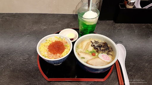I picked the Super Combo ($21.90) which seemed a bit expensive but I figured it was a good deal because, in addition to the bowl of Shio Ramen, it came with a bowl of Ikura & Grilled Salmon Don as well as a Japanese Melon Soda with Ice Cream… and ever since our trip to Japan, I’ve been craving that wonderful green elixir of melon soda.