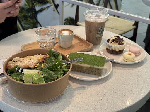 We got a chicken salad, a cheesecake muffin, a matcha tiramisu, two macaroons, a macchiato, a cold brew cream, and a mocha.