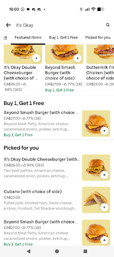 I placed an order through Uber Eats in a Buy 1, Get 1 Free. The app didn't show the 2 items after my purchase, even though the process was there and the bill showed I was paying "half price" because I was getting 2 instead of one with the crossed full value and the new value of just one item.