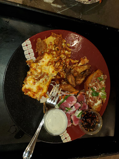 We ordered the following: Lasagna with Meatballs Potato skins Sesame encrusted Ahi tuna appy SnP chicken wings Tower of Power Cheesecake Mud Pie