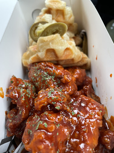 Read moreIt's time for fried chicken. But which one? After doing an extensive Google search, I decided to try Le Coq Frit. I had the impression that they had dine-in tables. But it was just a long bar along the window. We decided to try the Signature Chicken Burger, and Chicken & Croffles with a side of Cole Slaw. The Chicken Burger was scrumptious, very juice. I've ordered many chicken in waffles at various restaurants, and 99% of the time, the chicken was over-fried, too crispy and dried out. This was not the case. It almost seems like the chicken had been brined and lightly sous vide before dipping in batter and deep fried for a very short time. The outer crispy bits were medium crunch rather than rock-hard crunchy like those I had often encountered. The chicken pieces in the Chicken & Croffles were much smaller than the piece in the burger. I am not a heavy sauce person, so I didn't like the sweet & spicy sauce drenched over my pieces of chicken – I must remember to order sauce on the side next time. The croffles were enjoyable. I couldn't finish them. The most disappointing item was the cole slaw. The photo on the website looked like cooked pickled red cabbage, I should have known that cole slaw would not look like that and my cole slaw was pitiful. While it tasted fine, the red cabbage was shredded too thing, and this dish definitely does not resemble the photo as advertised. I asked while ordering whether the Chicken and Croffles would have garlic. The order server indicated strongly that there would be no garlic. However, my internal garlic meter says otherwise. I felt uncomfortable after the meal. I think food outlets need to be more aware of the fact that garlic allergies can cause serious problems! We came back again and ordered just the crispy chicken pieces with sauce on the side. Definitely, the sweet and spicy sauce smelled strongly of garlic. The chicken also left an after taste of garlic but not as strong as the sauce. As to their desire to provide the best dining experience – the servers here consistently go out of their way to be attentive and polite. They were more courteous than our local Japanese restaurant. At least, they delivered...
