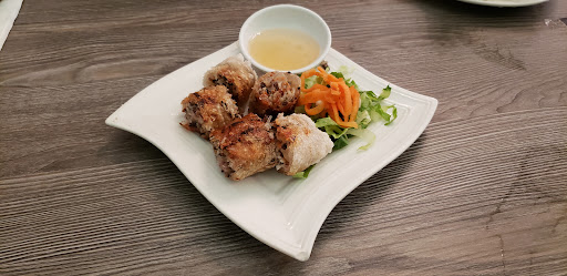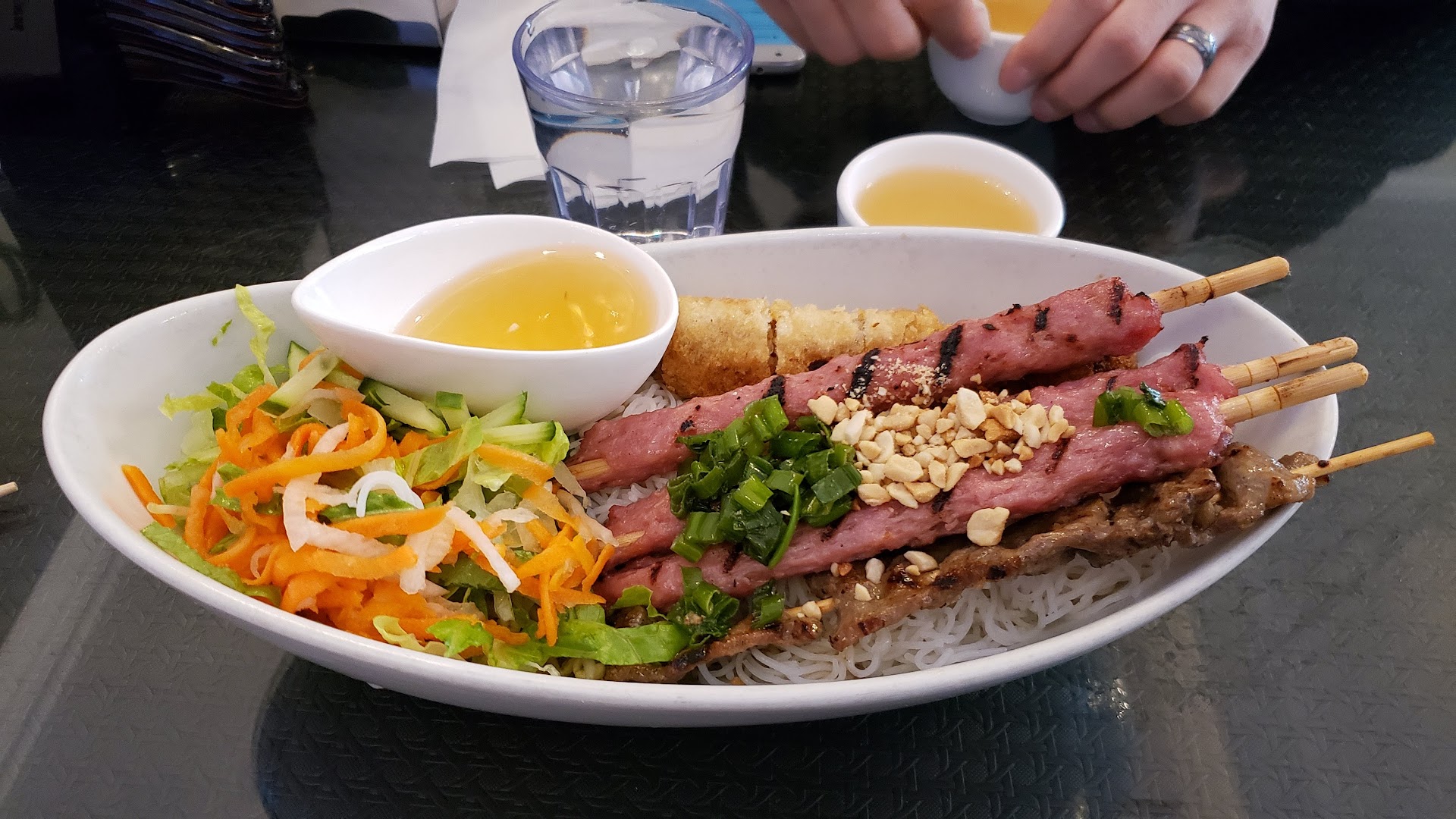 Read moreCame by this evening when our first choice as closed for the day. The restaurant name implied that their dishes would be authentic. Service was immediate when we entered. Brightly painted walls with modern decor, chandelier lights, comfortable chair and bench seating and dining tables. Ordered the spring roll appetizer, #65 pork chop & grilled chicken on rice, #54 spring roll, BBQ beef skewer, ground pork sticks on rice vermicelli and #19 pho noodles with rare beef, beef brisket and tripe. We also ordered a coke and a Vietnamese ice coffee. Imagine my shock when the waitress delivered my coffee arrived. It was not the traditional slow drip filter French coffee over condensed milk with a pitcher of ice!! When I questioned the waitress she didn't understand what I was asking. She then admitted to me that they didn't offer that kind of drink. What?? The $4 ice coffee drink I got was more ice than coffee, really strong and really sweet. I was extremely unhappy with this beverage. There was no way I could modify the coffee to my taste at all unlike the traditional drip coffee. The ground pork wrapped around the sticks was thin and dry. It would have been juicier if the combined pork from all 3 sticks was wrapped around one stick. The BBQ beef lacked any distinctive marinade seasoning, the spring roll was tasty thankfully but the dip could have been more strongly flavoured with fish sauce and chili flakes. The complimentary side bowl of broth that accompanied the pork chop and chicken dish had tart, savoury and herbaceous elements. A lovely contrast to the main dish. My son's pho was excellent according to his remarks. The taste of tripe was a new experience for him. We tried his soup broth and found it was intensely beef flavoured. Overall I would be more careful about my choices if we a e back...
