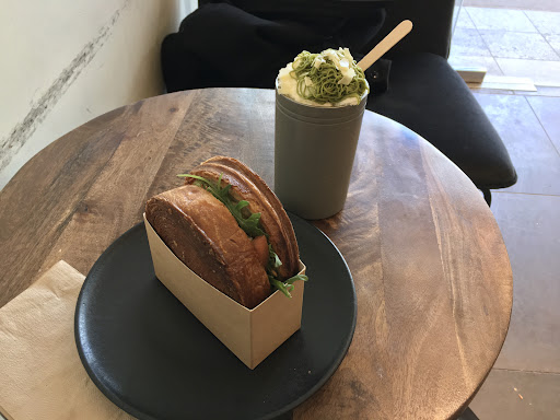 Read moreI came to try the Hot Chocolate Fest matcha mont blanc hot chocolate, a white matcha hot chocolate topped with matcha vermicelli made from chestnut paste. I'm not much of a hot chocolate drinker but I love matcha and chestnut so this was one of the few Hot Chocolate Fest drinks that caught my attention. The drink lived up to my expectation: the matcha was good, and the vermicelli had a really cool texture and nutty flavour that made it super fun to drink. What actually stole my heart at this cafe was the sandwich I bought to accompany the hot chocolate! I got the "vegan" sandwich on the supreme croissant (the filling of the sandwich was the vegan filling, but this sandwich was not actually vegan because the croissant contains butter - you can get it on sourdough for an actual vegan sandwich). The croissant was amazing, with a crispy caramelized shell and tender inside. The way that the dough flaked with each bite was so satisfying. The veggie filling was simple and straightforward and that was fine because the croissant was just so extraordinary. Good service from the staff, who brought my drink and croissant to my table, and also made sure to check when I ordered to make sure I knew that the croissant wasn't vegan. As the name implies, the cafe is on the smaller side, but there's a decent amount of comfortable seating available and I had no problem getting a table. If you see croissant crumbs all over the floor like I did, do not be alarmed because they do sweep them up often, this is evidently just what happens when you have lots of people eating flaky croissants. I was there around noon on a weekday and they were out of the filled supreme croissants. I heard someone else come in and ask about them and they said they'd have more later, so I guess they bake them...