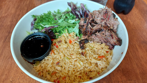 I opted for the Teriyaki Beef Brisket Rice Bowl to satisfy my yen for their usually succulent brisket. Served in a Japanese themed wide bowl, it consisted of jambalaya rice, mixed greens and a fist sized serving of chopped brisket. The teriyaki sauce was served on the side.