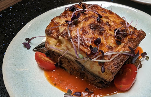 Then comes two juicy pieces of grilled Lamb Chops ($9) with black-eyed bean salad and Vegan Mousaka ($20). First bite and she finds herself in love with her luscious meal; the roasted layers of eggplants, filled with zucchini, potatoes, mushrooms, and lentills finished with creamy soy-milk Bechamel sauce is really an exquisite work of cultured imagination and skilled chiefhood. I know all this because, between my devouring of the reddish meat around the white ribs, She straightens her arms fully open from the other side of the table to put a spoon of her food into my mouth, and I feel a few drops of tears rolling down my face. Birthday mission accomplished!